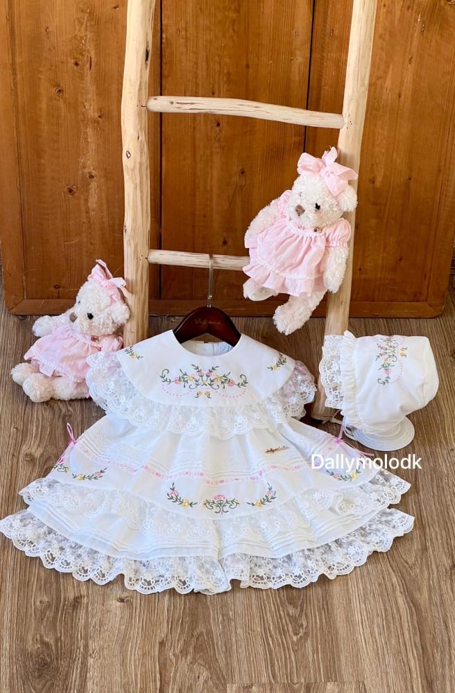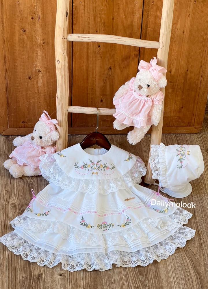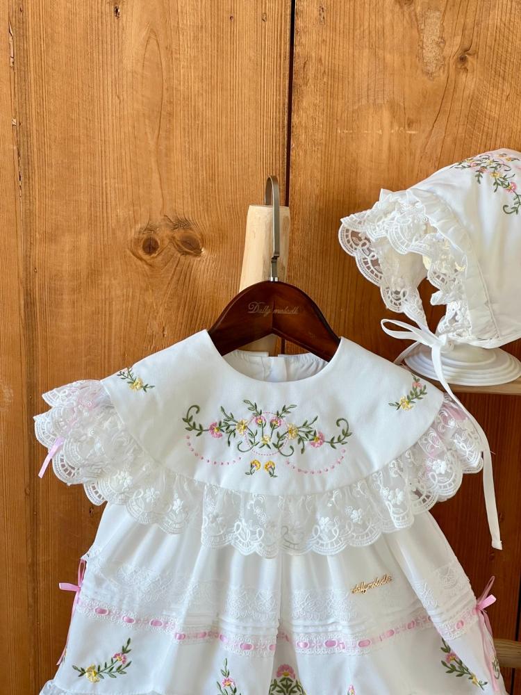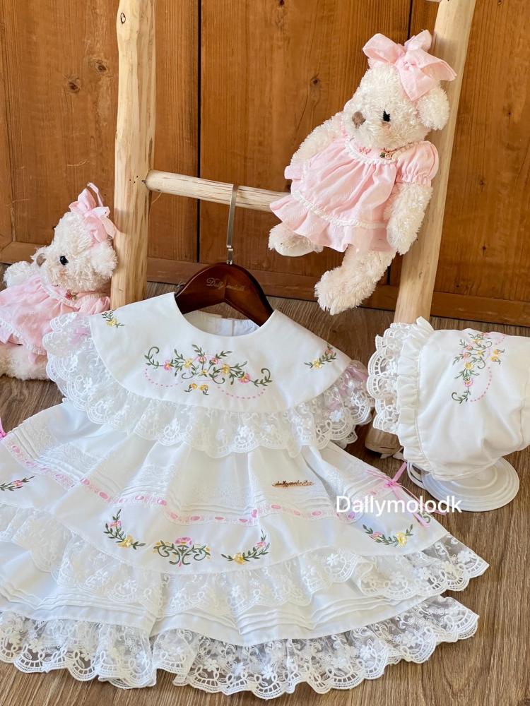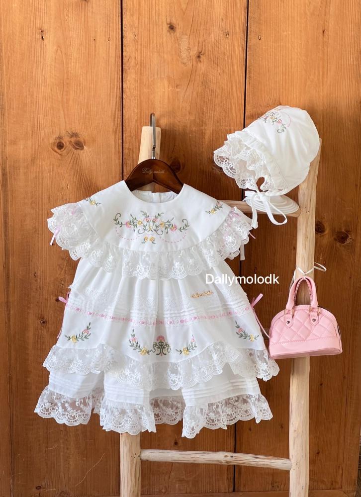فستان أبيض من 0_3 قبعة الشهور الى 9_12 مع القبعة الفرنسية ومن 1 سنة الى 5 سنوات بدون القبعة