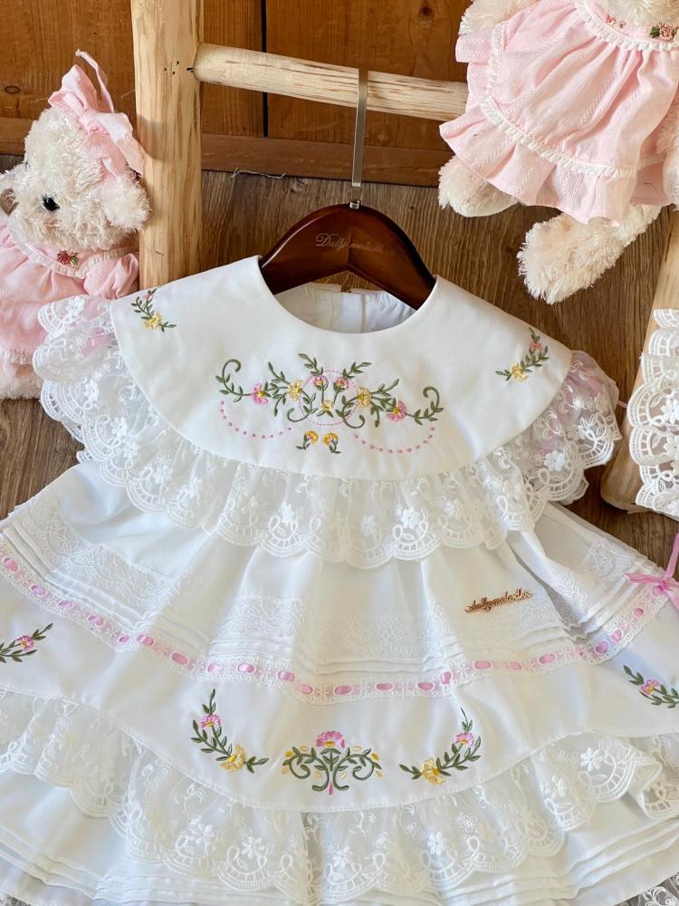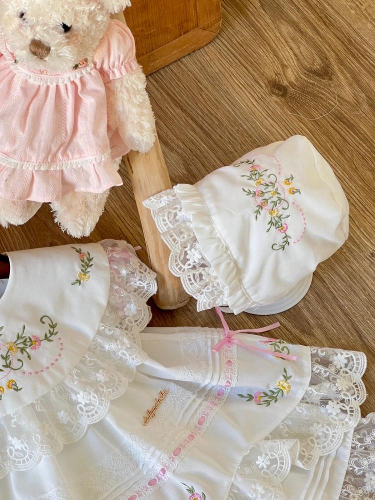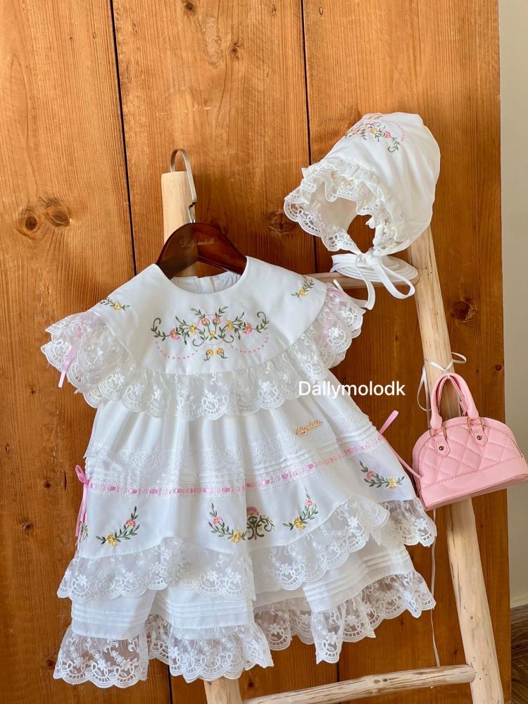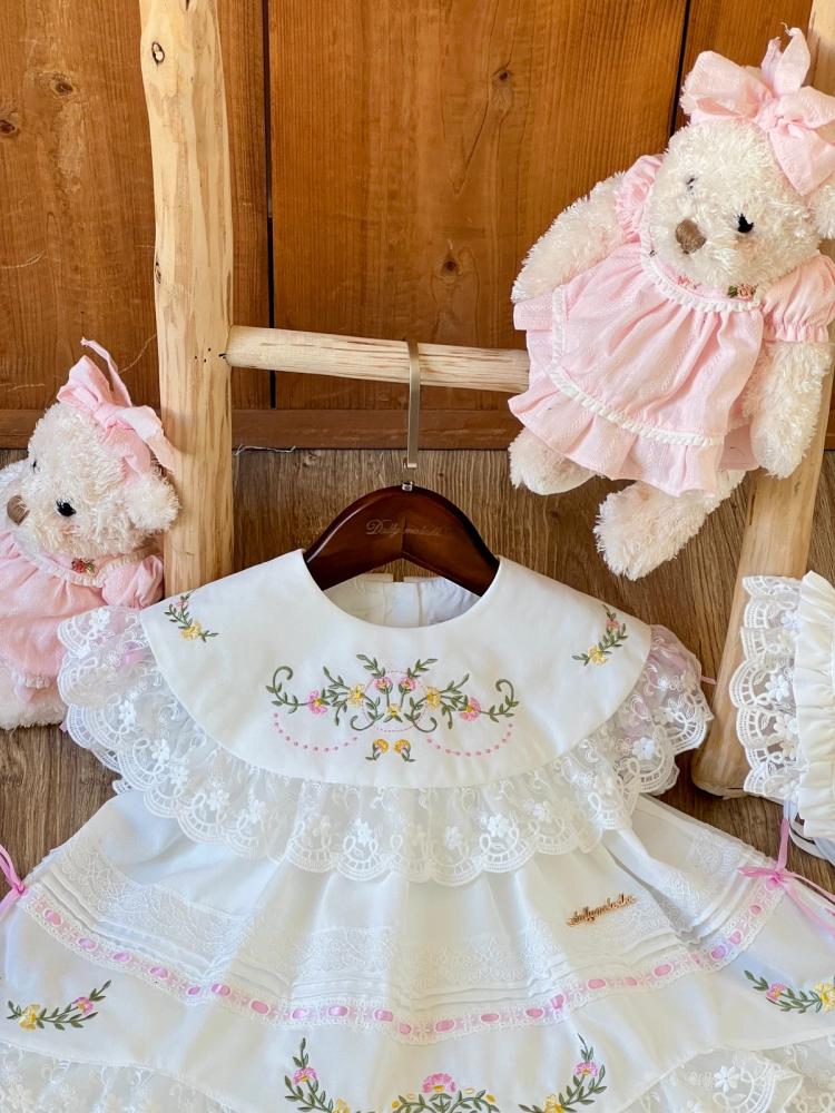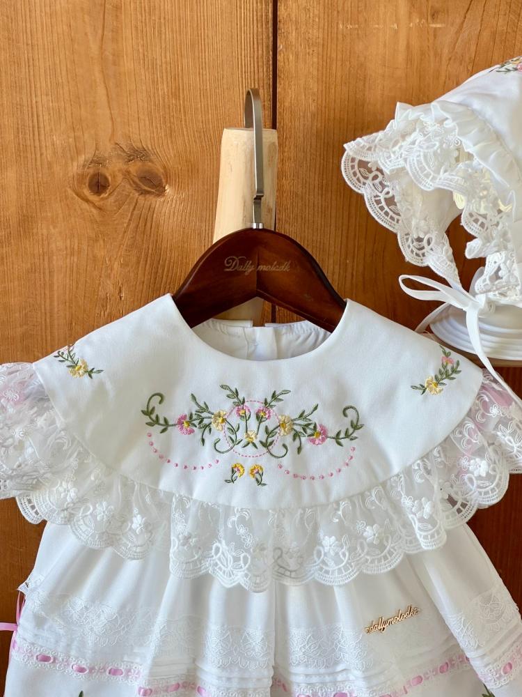 فستان أبيض من 0_3 قبعة الشهور الى 9_12 مع القبعة الفرنسية ومن 1 سنة الى 5 سنوات بدون القبعة